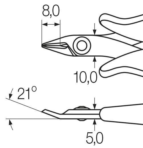 Forma del cabezalCabeza estrecha en punta.MaterialAcero especial para herramientas C 70.AplicaciónCorte a ras con total precisión de cables blandos en electrónica, en lugares de difícil acceso.