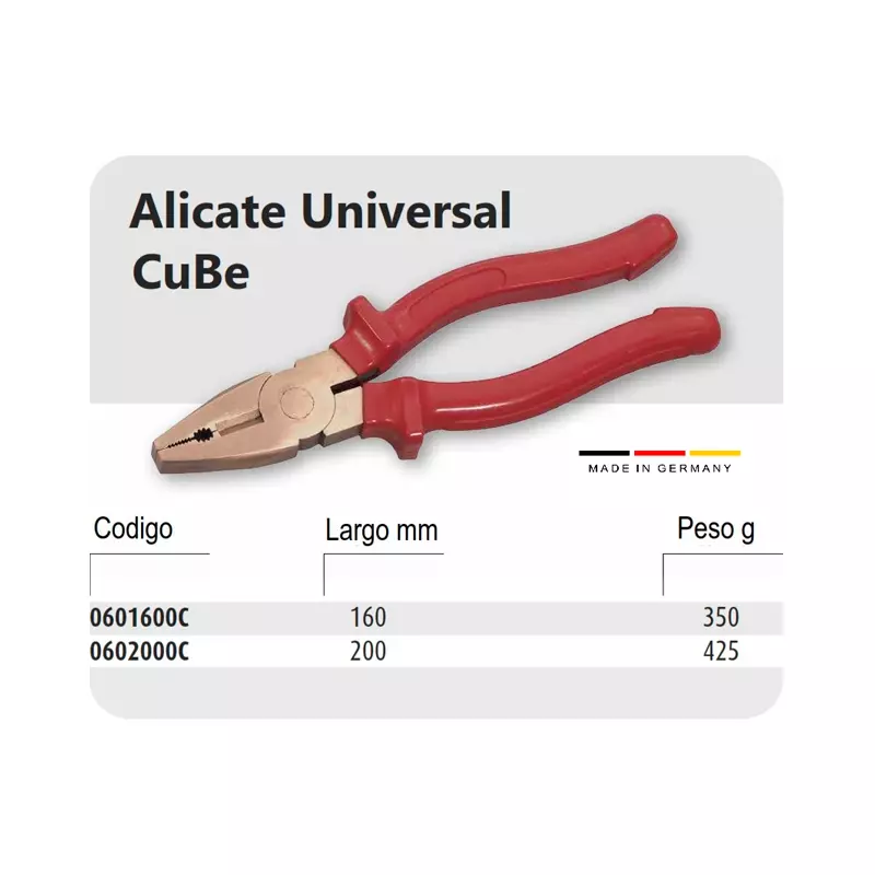 Este alicate universal antichispa ha sido fabricado con una aleación de cobre-berilio certificada por el Instituto Federal de Investigación y Testeo de Materiales (BAM), garantizando que cumple con las regulaciones de seguridad para zonas ATEX y áreas con riesgo de explosión. Su fabricación en fundiciones alemanas certificadas y su forja con ingeniería de precisión alemana aseguran un producto de larga vida útil y máxima seguridad.