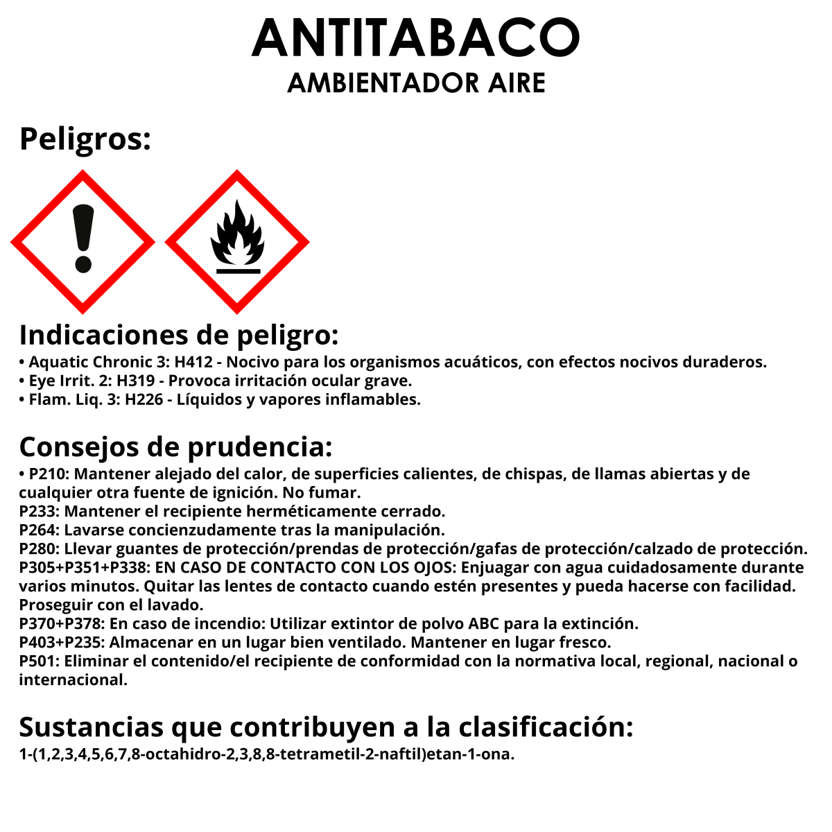 Formulado para eliminar olor a tabaco en todo tipo de estancias en colectividades, hostelería y utilizado con éxito en el automóvil. Con un par de nebulizaciones en el habitáculo desaparece el molesto olor a tabaco en cuestión de segundos.