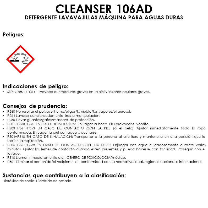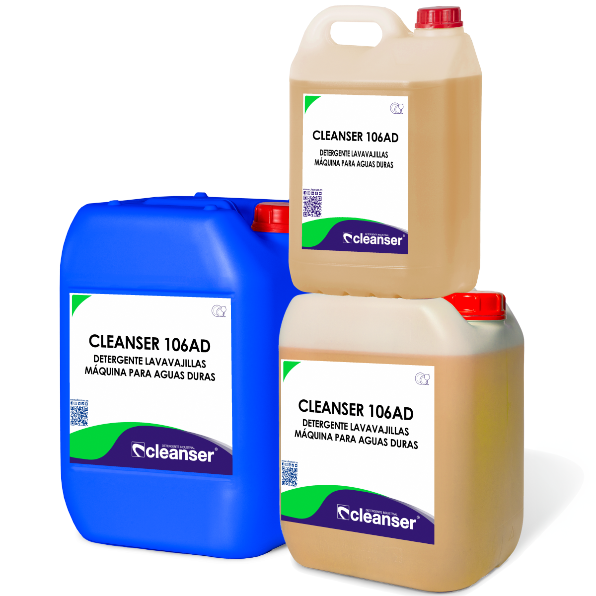CLEANSER 106AD Es un detergente para máquinas lavavajillas con elevado poder desengrasante, a la vez que elimina todo tipo de residuos orgánicos como proteínas, taninos, albúmina, etc. Gracias a su contenido en tensioactivos de baja espumación, penetra en la suciedad haciéndola emulsionar sin afectar al buen funcionamiento de la máquina. Debido a su contenido en secuestrantes y anticorrosivos no deja restos de cal ni corroe la vajilla ni la máquina, incluso utilizando aguas de extrema dureza.