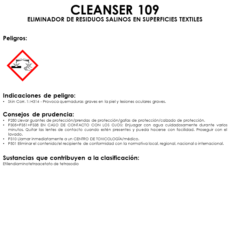 CLEANSER 109 es un producto diseñado para la eliminación de residuos salinos en superficies de naturaleza textil, tales como lonas, lonetas, telas vaqueras, tapicerías y moquetas de vehículos. Adecuado para tejidos