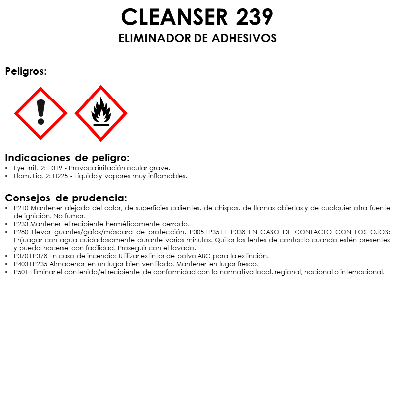 CLEANSER 239 es una combinación de disolventes y alcoholes específica para la eliminación rápida y sin rastro de pegamentos sobre todo tipo de superficies duras. Está especialmente concebido para quitar adhesivos en vehículos antes de ser repintados.