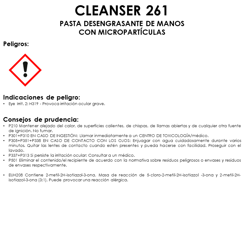 Cleanser 261 es una pasta desengrasante enérgica para manos provista de micropartículas que se puede penetrar en uñas y huellas dactilares. No irrita ni produce escamaciones típicas de los productos cáusticos y abrasivos. Su elevado poder humectante le permite disminuir la tensión superficial de grasa y aceites, por lo que proporciona una limpieza completa.
