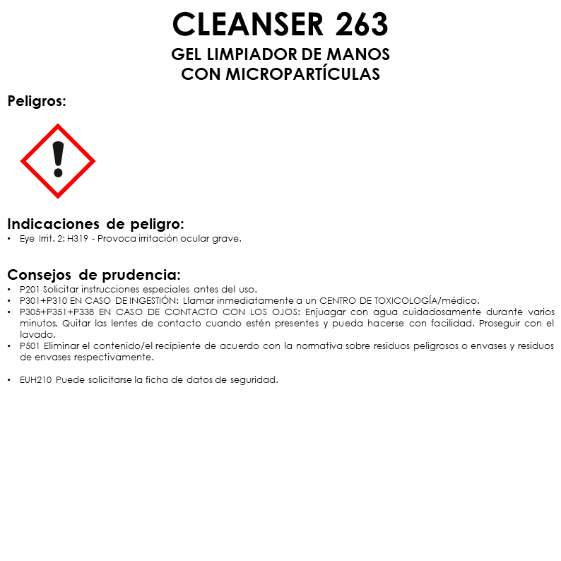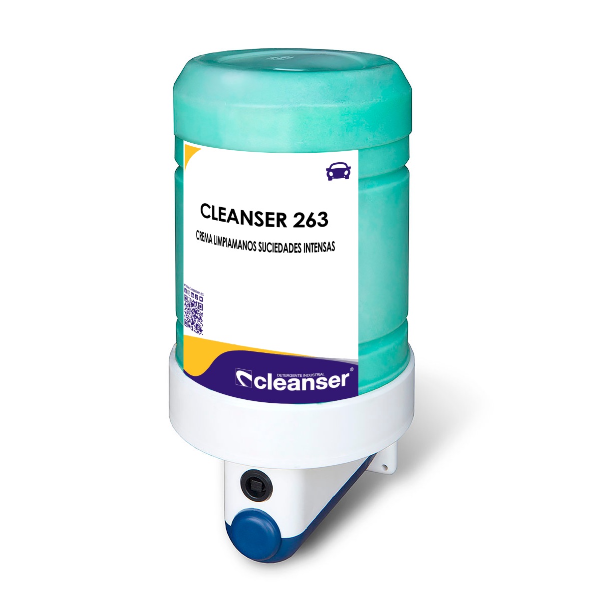 CLEANSER 263 es un gel para el lavado y aseo de las manos que presenten problemas de ensuciamiento profundo y persistente como grasas, aceites quemados, lubricantes, tintas, carbonillas u óxidos. Se recomienda especialmente en talleres de automoción, mecanización de metales, fundición, imprentas, gasolineras y en general cualquier industria donde puedan producirse suciedades profundas y persistentes. Se puede adquirir el producto con el dosificador incluído.