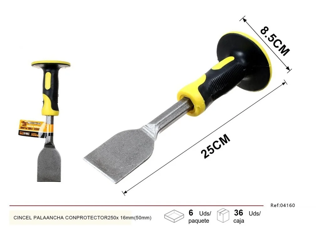 El cincel pala ancha con protector de 250x16mm (50mm) es una herramienta fundamental para albañileros. Su diseño permite un corte preciso y eficiente en diversos materiales de construcción. Ideal para trabajos que requieren un acabado profesional.