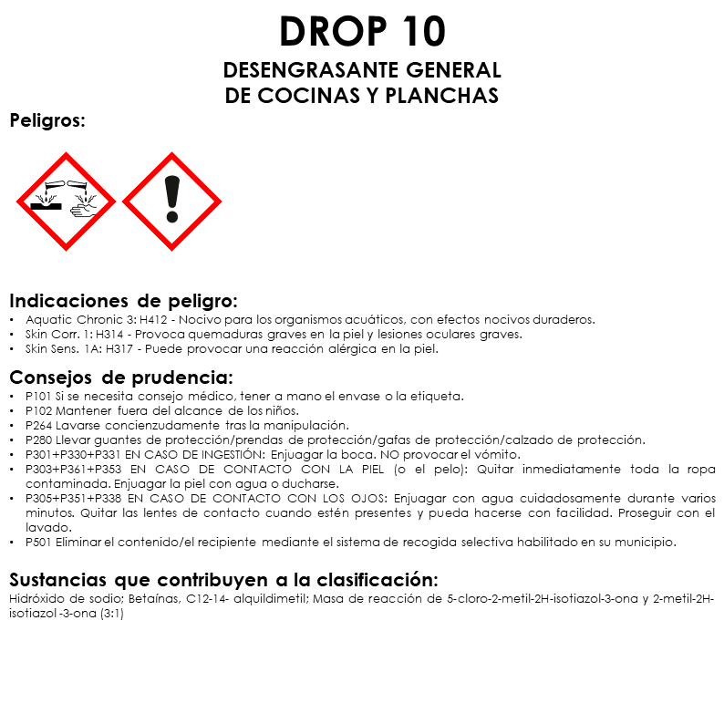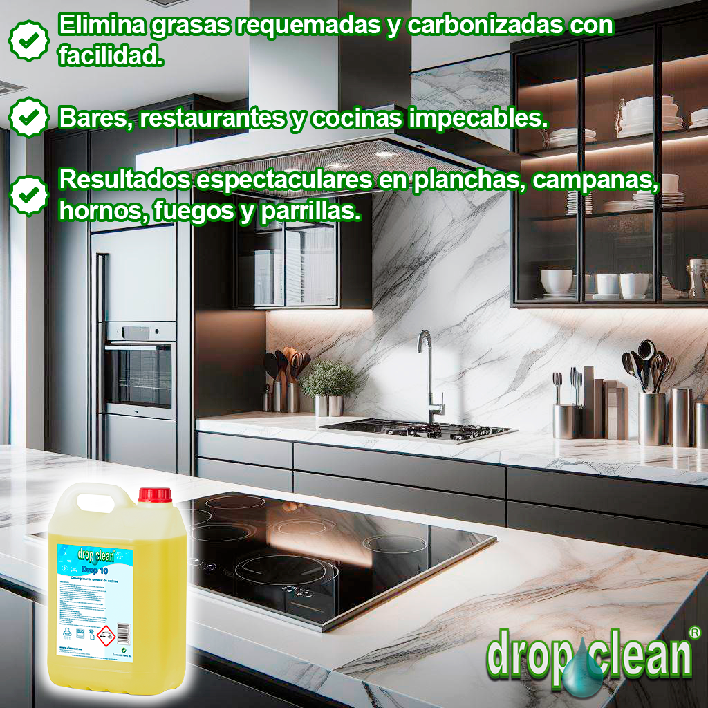 DROP 10 es un desengrasante enérgico para grasas re quemadas y carbonizadas, especialmente recomendado para planchas de cocina. Es perfecto para hostelería y colectividades, de elevada alcalinidad. Su elaborada formulación facilita una rápida acción sobre los residuos de las grasas y permite su rápida eliminación, con un nivel controlado de espuma para facilitar el enjuagado. Es útil en planchas, superficies de acero inoxidable, melamina y tablas de cortar.