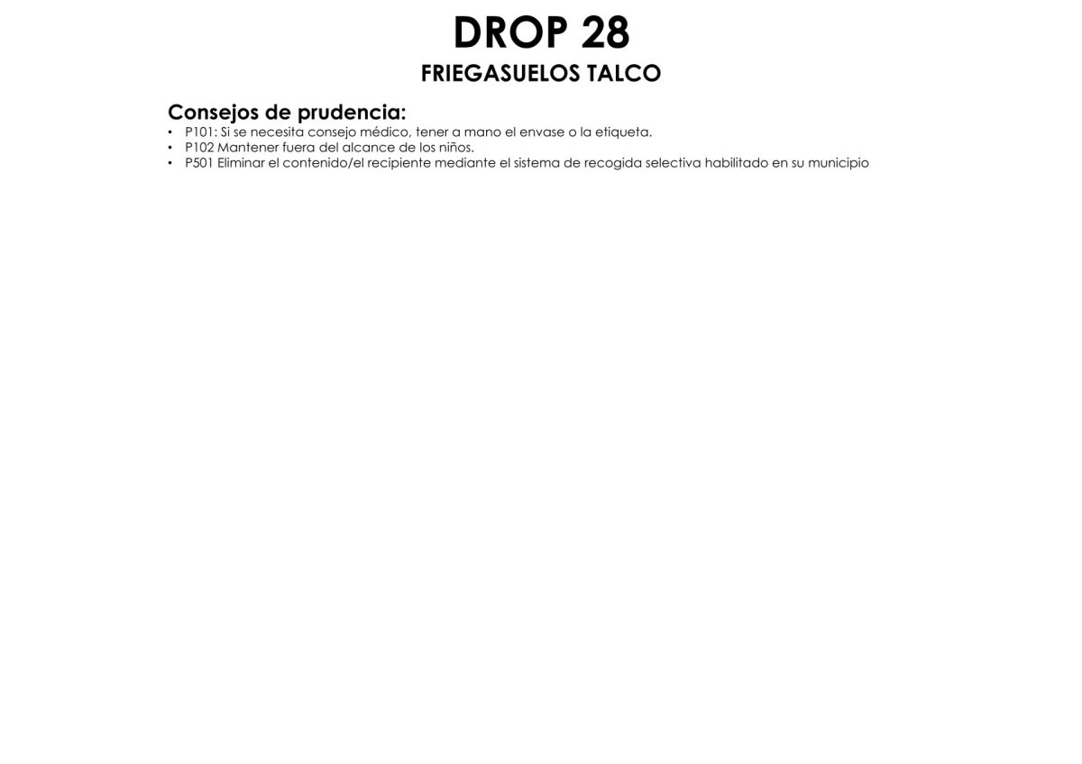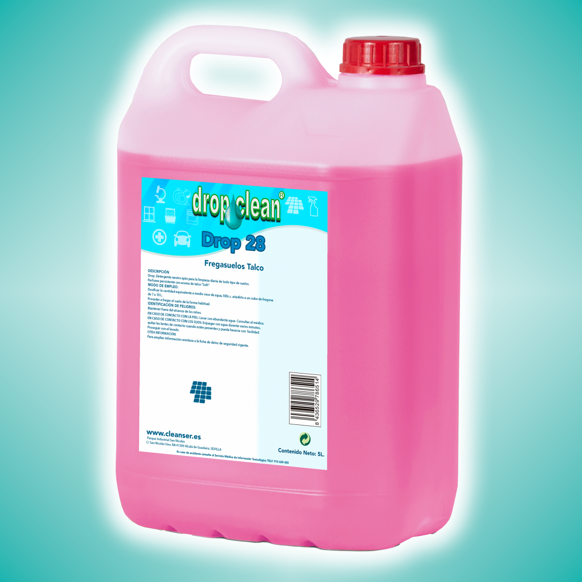 Drop 28 es un detergente friegasuelos neutro apto para la limpieza diaria de todo tipo de suelos. Genera una abundante espuma de fácil aclarado. Tiene un perfume persistente con un suave aroma de talco. Un limpiador de suelos con la garantía de un producto de toda la vida y un aroma muy poco convencional.