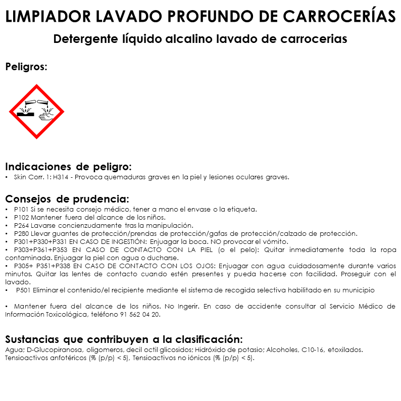 LIMPIADOR PROFUNDO DE CARROCERÍAS es un detergente líquido alcalino, totalmente soluble tanto en agua fría como en caliente. Contiene una selección de tensioactivos que permiten la eliminación de las diferentes suciedades existentes. Hay que tener en cuenta que éstas varían según las estaciones del año, zonas geográficas y productos químicos en suspensión de la atmósfera como humos, grasas, polen y barro, etc. Posee un equilibrado poder espumante para posibilitar su utilización con los modernos equipos de rociado. Sus características secuestrantes hacen que su rendimiento sea óptimo incluso en las zonas de agua de extrema dureza, evitando las obstrucciones y desgastes en boquillas, tuberías y bombas.