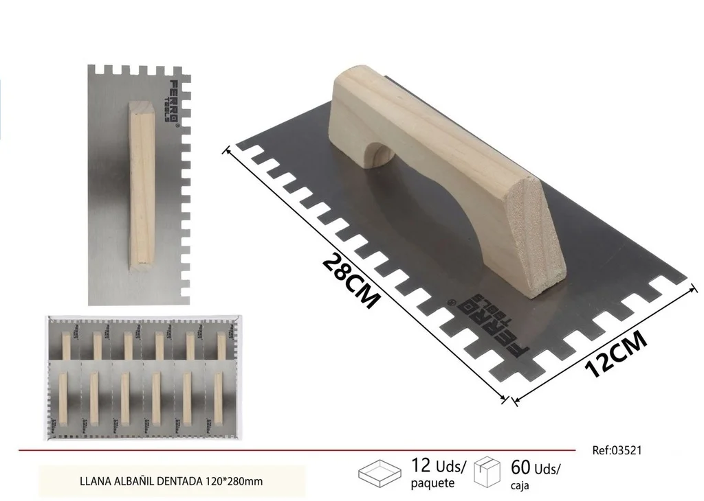 La llana de albañil dentada de madera completa 120280mm es ideal para profesionales de la construcción que buscan eficiencia y comodidad. Su diseño ergonómico permite un uso prolongado sin causar fatiga en la mano.