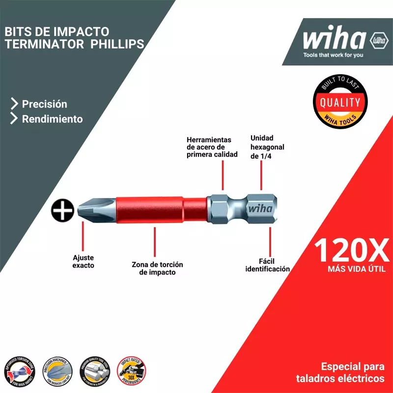 Las puntas bit de impacto MaxxTor® Phillips de Wiha, están clasificadas para usarse con herramientas eléctricas y rigurosamente tratadas térmicamente para producir una broca que dura hasta 120 veces más que las brocas estándar.