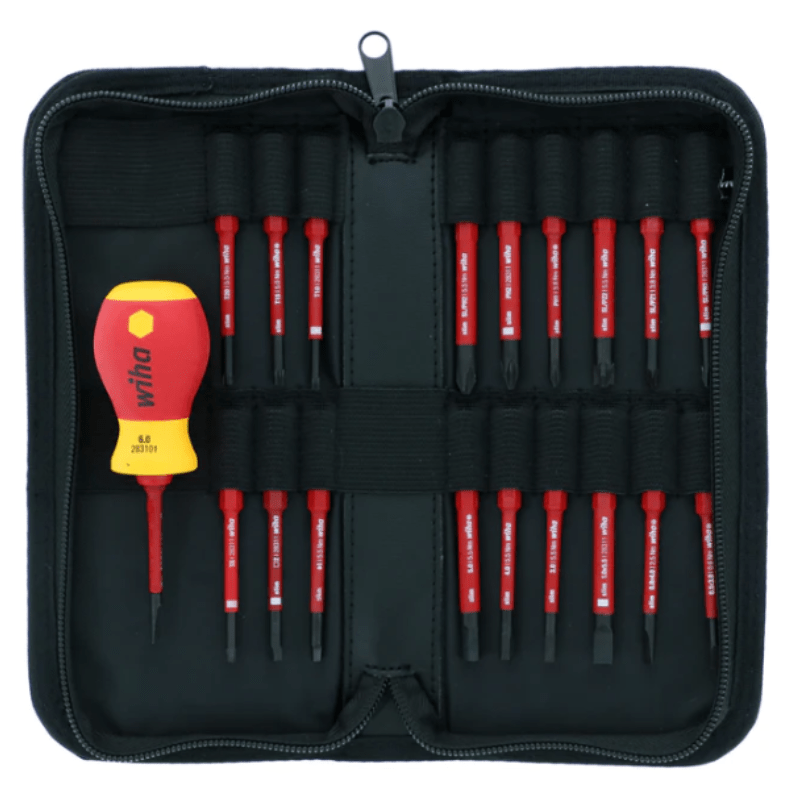 El set de Bits y Mango Aislado SoftFinish SlimLine de Wiha es el estándar de calidad superior y cuenta con un mango ergonómico con agarre acolchado para mayor comodidad y control, construcción de doble durómetro para mayor durabilidad, mango moldeado directamente al porta varilas para una unión permanente y partes planas paralelas para evitar deslizamiento de la mesa.